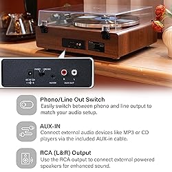 Fits All Your Records and Modern Needs: Whether you own 7”, 10”, or 12” vinyls, Annesburg 2-speed (33/45 RPM) belt-drive turntable plays them all with precision. It’s a true all-in-one hub featuring 4 built-in stereo speakers (two 15W woofers and two 10W tweeters) for instant play, plus RCA outputs to connect your pro home audio system. Perfect for beginners and seasoned collectors alike Authentic Warm Audio with AT-3600L: Experience the soul of vinyl with the pre-installed Audio-Technica magnetic cartridge and adjustable counterweight. Unlike cheap sapphire needles, this setup ensures minimal distortion and protects your rare records from scratches, delivering the rich, high-fidelity sound audiophiles crave Modern Wireless Convenience: Don't let your digital playlist go to waste. Seamlessly pair your iPhone, Android, or tablet via Bluetooth 5.0 to use the turntable as a high-quality wireless speaker. It’s the perfect bridge between vintage aesthetics and modern technology for your daily background music Worry-Free Listening and Energy Saving: No more rushing to the player when the music ends. The intelligent auto-stop function halts the platter 3 minutes after the final track to prevent needle wear and save power. While the tonearm remains for a manual "pro" feel, our tech support is always on standby to ensure your setup is pitch-perfect Elegant Wood Finish for Any Room: Crafted with a sophisticated wood and metal layered design, Annesburg record player doubles as a stunning piece of home decor. Includes a removable dust cover to keep your setup pristine. An ideal gift choice for birthdays, Christmas, or anniversaries that will impress any music lover