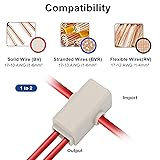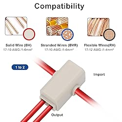 Specifications: This 1 in 2 out T-type quick connect suitable for 17-10 AWG (1-6mm²) wires, rated up to 60A /400V, suitable for high-power wiring in automotive, marine, and solar systems Premium Materials: Built with solid brass conductors and ABS fireproof casing, these quick wiring connectors ensure excellent conductivity, flame resistance, and long-lasting durability even in harsh environments High Efficiency: The 1 in 2 out T Tap design enables fast, solderless connections without damaging the wire core. Keep your wiring neat, organized, and safe from short circuits or loose ends Easy Installation: Simply strip 10mm of insulation, secure with screws, insert into the base, and close the cover. With included wire nuts, you get secure, tool-free connections in seconds Wide Application: Terminals connection are ideal for automotive, marine, RV, trailer, motorcycle, and solar wiring projects. Also perfect for DIY electrical and electronic setups, providing versatile solutions for multiple industries