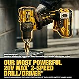 Our Most Powerful 20V MAX* 2-Speed Drill Driver** - Complete a wide range of applications with this drill/driver that is up to 109% more powerful. Help Maximize Control - Equipped with the ANTI-ROTATION System that senses the rotational motion of the tool and shuts it down if the motion is excessive. The red LED indicator illuminates when the ANTI-ROTATION System is engaged. Competitive Advantage - Dominate demands with this tool designed to be up to 25% more powerful vs. Milwaukee***. Professional Performance - Complete jobs with top level speed, control, and precision with a high-speed transmission and variable speed trigger featuring 2 settings (no load 0-650/0-2,000 rpm). Bright LED Work light - Illuminate dim work areas with an adjustable, 3-position LED featuring 70 lumens and auto-shutoff function. Help Maximize Productivity - Make up to 175 holes per charge. High Bit Retention - Work confidently with a 1/2 in. metal ratcheting chuck that provides secure bit retention. TOOL CONNECT CHIP READY - Featuring TOOL CONNECT CHIP READY functionality (DEWALT chip sold separately) when paired with the DEWALT Site Manager app that shows data on jobsite asset management and tool location. Part Of Our Best Performing Line Of 20V MAX* Power Tools – Innovative power tools designed to deliver certainty for the world’s toughest pros.
