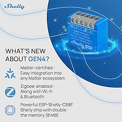 - Shelly 1 Mini Gen4 - Shelly's next generation compact smart switch for controlling lights and small appliances up to 8 A. Equipped with Shelly chip and multiprotocol connectivity support: Wi-Fi, Zigbee, Bluetooth, Matter.Small Size, Big Impact! - Shelly Mini Gen4 packs all the power of standard smart devices into a compact design. With an upgraded processor and 8 MB memory, it offers faster, smoother performance. Matter-certified and multi-protocol compatible, it fits seamlessly into any smart home setup.Size does matter! - Shelly's mini devices open up a world of possibilities, allowing you to seamlessly integrate them into even the most tightly packed spaces and switch boxes. Whether you want to schedule your lights to turn on at sunset or remotely control your fan from the comfort of your couch, Shelly 1 Mini Gen4 puts the power in your hands.Make any small appliance smart with the Shelly 1 Mini Gen4. Its 8A capacity is ideal for upgrading small to medium devices like lamps and coffee makers. Easily install it in a socket or discreetly inside the appliance’s casing-no extra wiring needed.Control your garage door easily with the compact Shelly 1 Mini Gen4. Install it inside the opener’s housing or near the motor for flexible placement. Its 8A capacity ensures reliable performance, letting you operate your garage door remotely without bulky external modules.Lighting Control Wherever You Need It - The compact Shelly Mini 1 Gen4 fits discreetly in ceiling roses or tight wall boxes. Once installed, control your lights or appliances via the Smart Control App, preferred platform, or voice assistant. Customize schedules to save energy-like automatically turning off hallway lights after bedtime-while still allowing manual switch use for everyone’s convenience.