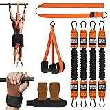 - [Complete Set for Pull-Up Training] The Heavy Duty Pro Set includes 4 resistance bands (50, 75, 100, and 125 lbs), a dual-foot rest, and a pair of leather wrist straps. This all-in-one training kit helps users safely progress toward unassisted pull-ups while protecting hands and joints during intense sessions. [Enhanced Comfort and Stability] Designed to improve grip security and overall balance, the added components reduce discomfort during training. The leather wrist straps help prevent wrist pain and hand blisters, while the stable foot support ensures better control and posture throughout each pull-up. [Durable & Reinforced Construction] Each band features a natural latex core protected by a cloth cover to prevent snapping and abrasion. Paired with heavy-duty metal hooks and secure buckles, the set ensures long-lasting performance and minimizes the risk of injury from broken bands. [Upper Body Strength Made Simple] Train your back, arms, chest, and core without needing a partner. The assist bands support controlled movements, making pull-up practice safer and more effective while promoting gradual strength building—all with easy, independent use. [Portable and Easy to Set Up Anywhere] Compatible with pull-up bars at home, in the gym, or outdoors, this set is simple to install and remove. Its compact design fits easily in your gym bag, so you can stay on track with your workouts wherever you go.