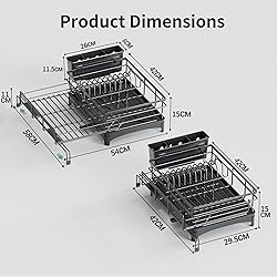 Extendable Design - Creating 45% Extra Space: This kitchen dish rack enhances your drying area by 45% with a pull-out rack as needed. It accommodates additional cups, vegetables, pans, and pots above your sink. Measuring 5.91" in height, 16.5" in width, and adjustable in length from 16" to 24.4", it features adjustable width feet to fit sinks of varying widths (≤17.5") 2-in-1 Design with Generous Capacity: Combining the functionalities of a dish drainer and a roll-up drying rack, this kitchen dish drying rack maximizes countertop space while offering ample room. It can hold up to 10 plates (≤10.5"), glasses, silverware, 2 pans, bowls, and more Efficient and Compact Design: Serving as a comprehensive solution for storing various kitchen essentials, this large dish drying rack accommodates dishes, bowls, glasses, cutlery, pans, pots, and more. The two enlarged slots are specifically designed to accommodate pans, thick plates, bentos, and pot lids, thereby freeing up space for other tableware Thoughful Drainage System: Featuring a drain spout, this dish drying rack efficiently directs excess water directly into the sink. The utensil holder is designed to drip directly into the tray, ensuring a clean and dry countertop Durable and Rust-Resistant: Crafted from high-quality metal with a rust-resistant coating, this kitchen drying rack ensures durability and sturdiness. The non-slip feet at the bottom provide stability and prevent sliding on the countertop