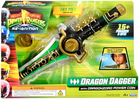 The Dragon Dagger is the signature weapon of the Green Ranger and with a press of a button, hear the signature Dragonzord song that will summon the Dragonzord! The Green Ranger gears up with his Power Coin and Dragon Dagger to join the Power Rangers in their quest to defeat Rita Repulsa and her evil space aliens!