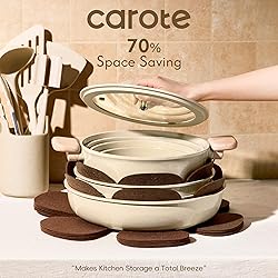 - CAROTE 25-Piece Ceramic Cookware Set – Detachable Handles, Non-Toxic & Induction Compatible The CAROTE pots and pans is a non-stick ceramic pots and pans set that combines style and functionality for your kitchen. This non-toxic cookware is ideal for apartment kitchens, new homes, and camping cooking sets, offering healthy, non-toxic ceramic coating that allows you to cook with little to no oil. The detachable handle design makes storage easy, saving up to 70% more space, and providing the ultimate convenience for small kitchens or RV essentials. Additionally, the removable handle allows for seamless transitions from stovetop to oven, to table, and is compatible with induction cookware. Whether you're setting up a new home kitchen or heading out on an adventure, this versatile cookware is your go-to for efficient cooking. Usage Rv essentials Kitchen essentials Kitchen essentials for new home New home essentials Housewarming gifts Apartment upgrades Wedding registry item Holiday hosting centerpiece