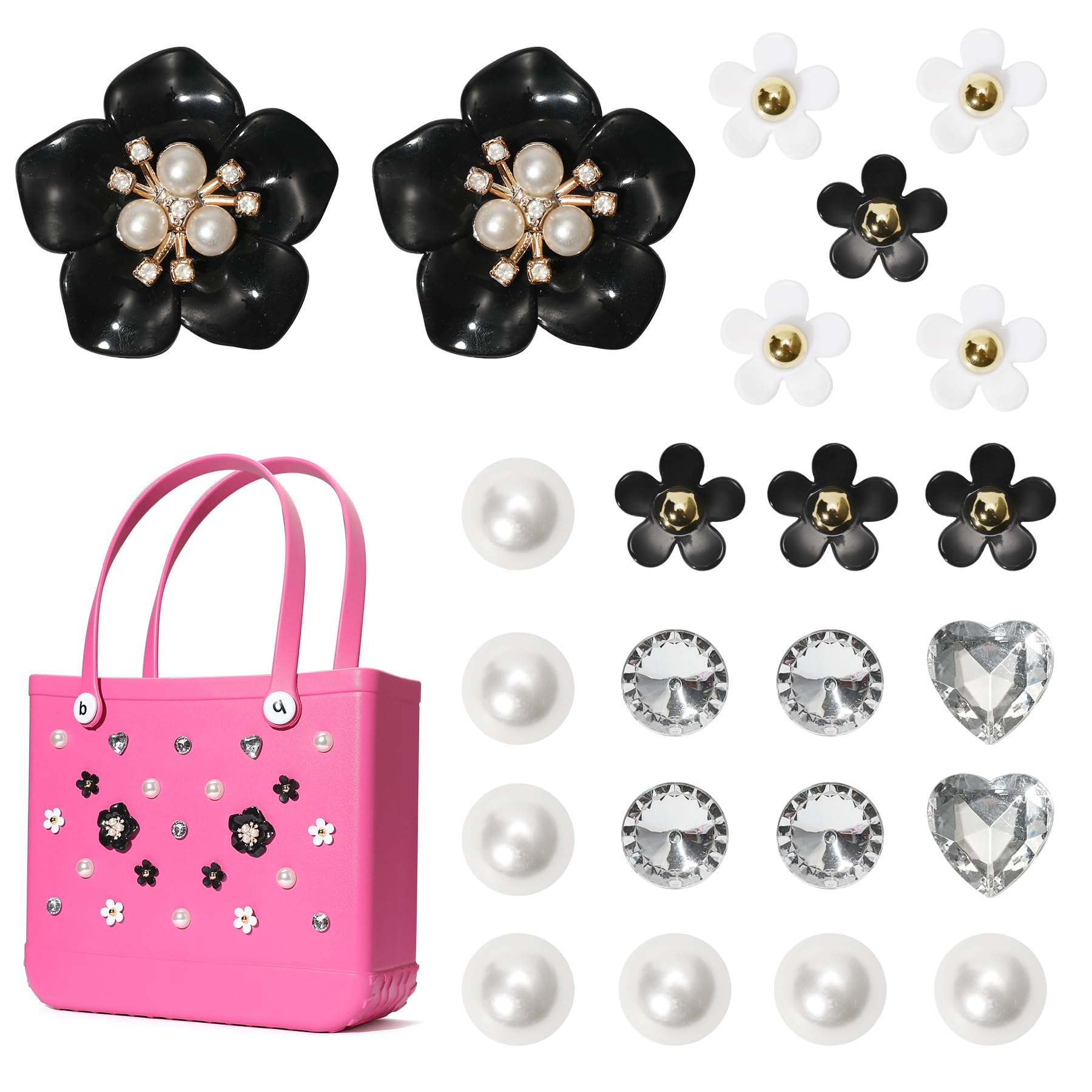 Elegant Pearl Chains- Includes 2 matte-finish pearl chains for draping elegantly over bag handles or weaving through grommets—adds instant boho-chic texture. Statement Floral Accents- Features 2 big flower charms with intricate petal detailing, perfect as focal points for your beach rubber totes. Sparkling Variety- Comes with 14 glossy plastic charms in assorted shapes (flower, butterfly, heart designs) to mix-and-match for personalized styling. Luxury Pearls- Includes 4 premium large pearls with smooth luster, ideal for balancing bold pieces with classic elegance. 【Versatile Styling】Inserted charms accessories specially designed for rubber tote bags. Make your unique totes stand out in various occasions, such as Christmas, shopping, dating, beach, party, etc. Favored by all women and girls.