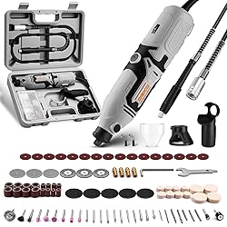 【Speed Adjustment & Flex Shaft】: The gray rotary tool equipped with a powerful 170w motor, 1.8m flexible shaft, 8000~35000RPM, 6-speed adjustment, gear adjustment making it easier and more table to adjust the speed, helping to complete handwork from cutting metal to polishing jewelry. The detailing kit with flexible shaft like a pen reduce vibration and better control for precision, corner polishing. 【127pcs Accessories Multi-purpose】: Cover Shield provide better protection for cutting and grinding. Drill Locator helps for precision woodworking. Buffing wheel can repair dents and clean surface dirt for a smoother, cleaner finish.Home rotary tool kit with multitools accessories, as mini sander tool, polisher, die grinder, wood carving/sculpting tools, grout removal tool, metal cutter, engraver etc, and enabling you to achieve different crafting work efficiently. 【ERGONOMIC DESIGN】: The body of the pink rotary tool is designed with soft rubber to ensure comfort during long hours of work.Assist handle for two-handed grip operation helps making better control for delicate work. The Ventilation holes in the housing dissipate heat during operation, maintaining consistent performance and extending the life of the tool. 【More Compatibility】: This power rotary tool is equipped with 4 collets: 1/8", 2x 1/16"((1 has been mounted on the tool), 3/32", offers wider compatibility and more stable when setting accessories for grinding, cutting, wood carving, sanding, engraving, and other working tools. The 3-jaw universal chuck stabilizes your project and allows to quickly and easy change accessories on rotary machine. 【As An Ideal Gift】: Small gray Rotary Tool Accessories Kit Set is beautifully designed with a tool storage box,pink color designed for women and ladies best gift for Christmas, birthdays, Thanksgiving, Mother's Day, etc. , especially for starter who enjoys crafting, DIY handmade and small home projects. The tool set including a corded rotary tool, multi attachments(with an attachment manual), a manual instruction,a clear plastic organizer box for attachments and a box.