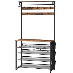 3-in-1 Functionality: This hall tree cleverly combines the functions of a coat rack, shoe rack and storage bag. The 6 shelves serve as perfect storage for shoes, while the 3 types of hooks hang various items. The side fabric bag facilitates your use Tiltable Design: This multifunctional entryway coat rack with shoe rack features 4 adjustable-angle mesh shelves, catering to different preferences for shoe storage. No matter how you want to store your shoes, this shoe rack can suffice your needs Reliable Construction: We carefully selected high-quality particleboard and metal to cast this shoe and coat rack. We also equip it with X-shaped back support and the anti-tip kit, letting you use with confidence Easy Assembly: The hall tree with bench comes with the necessary tools and illustrated instructions. The installation steps are clearly described and easy to understand. You just need to follow the instructions to assemble the labeled parts Stylish Appearance: The color combination of rustic brown and black exudes a subtle yet charming atmosphere, creating a textured ambiance in your home. Its versatile appearance can blend with any other furniture, highlighting your taste