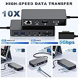 - 12 IN 1 Versatile NEW MS Surface Dock】Equipped with Surface Connection technology, this MS Surface PRO docking station offers a range of connectivity options for all your peripherals with 2x HDMI*4K@30Hz, VGA*1080P@60Hz, 100Mbps RJ45 Ethernet port, 2x USB C data port, 2x USB A 3.0 Ports, SD/TF card slot, 3.5mm Headphone Jack Port, DC Power Port, Surface dock With simple plug and play connectivity. 【Ultra HD 4K HDMI output & Triple Displays Surface Dock Hub】MS Surface Triple Displays(4K HDMI+HDMI+VAG) with extend or mirror mode, boost your efficiency 3 times, MS Surface Pro Dock Provide your Surface with excellent 4K HDMI and VAG ports. 4K HDMI support resolutions up to 3840 x 2160@30Hz. VGA port supports display resolutions up to 1920 x 1080@60Hz. 【Super Speed Data Transfer Surface Docking Station】This MS Surface Pro docking station comes with 2*USB A 3.0(5Gbps) and 2*USB C data (5Gbps) ports, allows you to connect keyboard,mouse,USB flash driver,USB C hard disks,etc. And extra SD TF ports allows you to read or download photo and video from your camera with up to 104Mb/s speed. Brings you much more convenience and save your time. 【MS Surface Dock Hub with Audio Output and Ethernet Port 】 Our MS Surface Pro Docking Station features the 3.5mm audio jack with delight listening to your favorite music, using your wired headphones with the classic 3.5mm cable. And Surface Docking Station offers full 10/100 Mb/s over RJ45 Ethernet port, which can download movies quicker, transfer files faster, and reduce latency, Surface dock ensure your network connection more stable. 【Broad Surface Device Compatibility】 This MS Surface Docking station with surface connection technology, is widely compatible with Microsoft Surface Pro 11/10/9/8/X/7/6/5/4/2017, Surface Laptop 7/6/5/4/3/2/1, Surface Laptop Go 3/2/1, Surface Go 4/3/2/1, Surface Book 3/2/1. (Please connect the power supply port when using) 【Minimal Design & 72W Power Supply 】The 12 in 1 surface pro docking station upholds a minimalist style.The latest surface accessories support 72W power supply, say goodbye to the original 45W charger, enjoy faster charging speed and improve your office efficiency.(Please connect the Surface docking station correctly according to the connection direction)