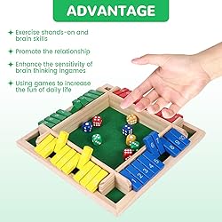 - ✨ Why Choose Us? ✨💖 Superior Quality:Our products are not only of premium quality, but also designed and innovated with a customer-centric approach, creating value for our customers. We understand our customers, use them as our benchmark, and stay close to them, matching them with our products. This ensures we can continuously deliver products that meet their needs.Quantity: 1 card flip game setProduct Color: MulticoloredShut the box game wooden is a multiplayer game for 2-4 people, perfect for playing with family and friends to strengthen relationships.Classroom games is not only a math game that promotes learning of addition, subtraction, multiplication, and division, but also a social pastime that fosters a sense of rules.4 player games is fast-paced and perfect for passing the time.Warm Tips:1. Due to display issues, there may be color differences between the actual table games and the image.2. If you encounter any issues with selecting and purchasing shut the box board game, please feel free to contact us and we will be happy to help you resolve the issue.3. Due to manual measurement, slight size differences may occur.