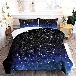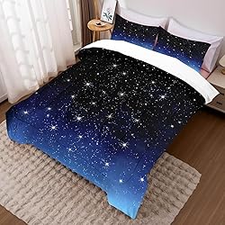 What You Can Get: galaxy comforter set full/queen size, 1 comforter 90"x 90", 2 pillow cases 20"x 30". Material: gradient glitter bedding set made of 100% polyester for all seasons,ultra soft, smooth and personality, let you have a warm and perfect sleep. Unique Design: the gradient glitter pattern adds a dreamy starry sky atmosphere to your sleeping space, turning your bedroom into a peaceful cosmic harbor, and its exquisite stitching not only improves durability, but also prevents the filling from moving or clumping, ensuring a comfortable sleep. Easy Care: machine washable in cold water gentle cycle, tumble dry at low temperature, cool iron if needed, do not bleach, do not soak. Great Choice: this blue star bedding set, with a white back, is a unique addition to bedrooms, guest rooms, children's rooms, vacation homes, hotels, or cabins. it can not only be used as a home decoration, but also as a gift for family and friends to express blessings to them.