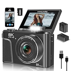【8K Video & 88MP Photos with Great Value】The 8K digital camera Capture ultra-clear 8K videos and stunning 88MP high-resolution photos. This camera delivers exceptional image quality and professional-level performance at an affordable price, making it perfect for beginners and a smart choice for daily use and travel photography. 【WiFi Connectivity for Easy Sharing & Webcam Use】This vlogging camera equipped with WiFi, this camera allows you to instantly download photos and videos to your devices and share them directly to social platforms like YouTube, Facebook, and Twitter. It also functions as a HD webcam, ideal for live streaming and video calls on multiple platforms. 【180° Rotatable 3-Inch Screen】The camera with 3-inch flip screen can rotate 180 degrees, making it easy to frame selfies and group shots from any angle. Whether vlogging or taking self-portraits, you’ll always have a perfect view. 【Wireless WiFi & Webcam Function】This vlogging camera features built-in WiFi, allowing you to instantly transfer photos and videos directly to your smartphone. Once transferred, you can seamlessly share your content on social platforms like YouTube, Facebook, and Twitter with just a few taps.Additionally, the camera can be used as a high-quality webcam, making it perfect for live streaming, video calls, and online meetings—giving you professional-grade video quality wherever you are. 【Beauty & Built-in Light】This camera features a built-in Beauty Mode that smoothens skin tones and enhances your natural features for flattering photos and videos.Additionally, its integrated fill light ensures you can shoot clear, well-lit content even in low-light environments, making it perfect for indoor recordings or nighttime vlogging. 【Camera Accessories and Specifications】This camera comes with two 1500mAh batteries, one wrist strap, one dual battery charger, one USB 2.0 data cable, and a user manual.The camera measures approximately 4.7" (L) × 2.1" (W) × 2.8" (H) and weighs 0.72 lb. 【Excellent After-Sales Service】 We are committed to providing the best service for every customer. Digital cameras are rather sophisticated electronic products. Should you encounter any issues, please feel free to contact our customer service team at any time. We offer around-the-clock support and will help you resolve any issues within 24 hours.