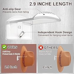 Extended Hat Hook: Our cowboy hat rack has been extended to 2.9 inches, providing ample space for your hat, ensuring that the brim of the hat does not touch the wall when hanging, effectively protecting your brim and wall. Two Ways to Install: Our cowboy hat holder can be directly installed on a non-tearable surface with pre-installed strong adhesive, which is very simple, or it can be installed on various surfaces with screws. Note: Please clean the wall before installing with adhesive, and wait 24 hours before hanging the hat. Anti-slip Design: Our hat hangers for wall adopts a special arc-shaped anti-slip tooth design, which makes the grip stronger, effectively preventing the hat from slipping, and can also keep the shape of the hat well. Extra Convenient Hook: There is a convenient small hook under the cowboy hat hook, which can be used to store various small items, such as keys, scarves, headphones, dog leashes, etc., which can maximize your storage space. Wide Application: The hat organizer is suitable for all wide-brimmed hats, such as cowboy hats, sun hats, baseball caps, straw hats, etc. Suitable for installation in the entrance, living room, bedroom, corridor, or closet. It is an ideal choice for your home space storage.