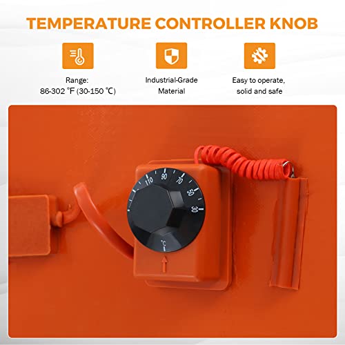 - TEMPERATURE CONTROLLER - The heating temperature can be controlled by a thermostat range of 86 to 302 degrees F (30 to 150 degrees C). For plastic drums, it is recommended to keep the thermostat set below 100°F (37°C).
