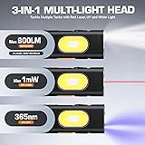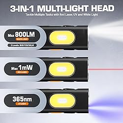 Compact & Magnetic Design: This EDC flashlight features a slim design (0.55" D × 1.21" W × 4.33" H, 85g), making it easy to fit in pockets or bags. The strong magnetic base securely attaches to metal surfaces, providing hands-free convenience for both indoor and outdoor use. 5 Lights & 11 Modes: This flash light combines white/UV/red light, red laser and red&blue strobe in one, with 11 switchable modes. Side light delivers up to 1200 lumens, head light up to 800 lumens, offering high-brightness lighting for multiple uses. USB-C Rechargeable: The rechargeable flashlight recharges via USB-C from a wall adapter, power bank, or laptop. Fully charges in about 2 hours, while the built-in battery indicator clearly shows charging status and remaining power. Versatile Carry & Convenient Use: The LED flashlight features a dual-direction clip for clipping to pockets, hats, or tool bags, keeping it within reach. The built-in lanyard hole allows hanging or carrying, offering flexible and convenient use. Durable & Widely Used: High-strength aluminum alloy body offers excellent impact resistance for long-lasting reliability. Perfect for emergencies, work, camping, repairs, outdoor adventures, or everyday home use.
