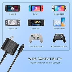 ⚡ 60W PD Fast Charging – Play While Charging:Equipped with 60W Power Delivery fast charging, this Switch 2 charger powers your console from 0–100% in about 2.5 hours. Supports play-while-charging without overheating, keeping your gameplay smooth and uninterrupted. Perfect PD charger for Switch 2, Switch OLED, Switch Lite, and Steam Deck. 📺 Switch 2 4K TV Dock Mode Support: Fully compatible with Switch 2 4K TV Dock Mode, delivering stable power for docked gaming on the big screen. Enjoy 4K ultra-clear visuals and lag-free performance with this reliable Switch 2 fast charging adapter. 🎮 Wide Compatibility: Designed in the integrated style of Nintendo Switch 2, this Switch 2 power adapter perfectly matches your console while also supporting Switch 1, Switch OLED, Switch Lite, and Steam Deck. One charger, multiple devices. 🛡 Advanced Safety Protection – Play with Peace of Mind: Built with short-circuit protection, over-voltage, under-voltage, over-current, surge protection, NTC temperature control, and chip overheat protection, ensuring safe and stable charging every time. A safe Nintendo Switch 2 PD charger for kids and adults alike. 🔌 Durable & Portable with 5FT Cable: Comes with a 5FT USB-C charging cable, offering flexibility while gaming or docking. Compact and lightweight design makes this Switch 2 wall charger easy to carry anywhere—perfect for travel, home, or on-the-go gaming sessions.