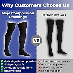 - Mojo Compression Men’s Thigh High Compression Socks 20‑30 mmHg – 3 Pack Get reliable, medical‑grade compression every day with this convenient 3‑pack of thigh high support socks. Designed to improve circulation and help manage leg conditions such as varicose veins, edema, chronic venous insufficiency, and post‑surgical swelling, these socks deliver firm 20–30 mmHg graduated compression from foot to thigh. The soft, breathable fabric is comfortable for all‑day wear, while the stay‑up band keeps the socks in place during work, travel, or recovery. Each pack includes three identical pairs, so you’ll always have a fresh pair ready. Note: Compression socks are designed to fit tightly for proper support and may require extra effort to put on—this snug fit ensures they are providing the intended medical‑grade compression.