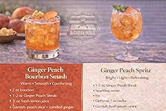 - Experience bold, refreshing flavor with the Barrel Roll Bar Essentials Ginger Peach Drinking Shrub, crafted with real peaches, ginger root, and white vinegar for a perfectly balanced mix of sweetness, spice, and acidity. This small-batch mixer brings a handcrafted depth that transforms everything from classic whiskey cocktails to bright, fruit-forward spritzers. Simply mix one ounce with your favorite spirit or sparkling water to create bar-quality drinks in seconds. The juicy peach pairs beautifully with ginger’s warm bite, making it incredibly versatile—ideal for mules, bourbon cocktails, tequila spritzers, or alcohol-free mocktails that still feel elevated. Barrel Roll Bar Essentials is committed to making mixology simple, fun, and delicious for everyone. With our full line of shrubs, syrups, rimmers, bitters, and cocktail mixers, you’ll have everything you need to shake, stir, and sip like the best bartender in your group.