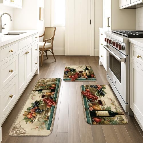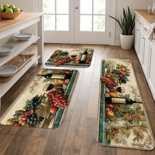 Vintage Fruit Kitchen Mats for Floor, Elegant Grapes and Wine Soft Mats, Cushioned Comfort Washable Non Slip Decor Rugs for Kitchen Sinks Laundryroom Bathroom 3Pcs