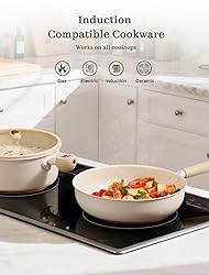 Ceramic Nonstick for Everyday Cooking: Smooth ceramic nonstick cookware lets food slide off easily with less oil. From eggs and pancakes to fish and veggies, cooking feels effortless and cleanup starts easier from the very first use. For best long-term nonstick performance, medium heat are recommended for everyday meals Healthy, Non-Toxic Pots & Pans Set: Made without PFAS, PFOA, PTFE, PFOS, lead or Cadmium, the ceramic-based nonstick coating is designed for daily home use without releasing harmful substances during normal cooking. Safe for everyday meals and family cooking, so you can prepare food with confidence and peace of mind Works on All Cooktops: Designed to perform on induction, gas and electric stovetops. The reinforced flat base promotes even heat distribution across different stovetop types, making it a versatile cookware set that fits modern kitchens, apartments, and changing cooking setups without extra worry Designed for Real Meals, Every Day: 18 pcs pots and pans set Including an 8'' frying pan for breakfast, an 11'' shallow pan for searing steaks or salmon, and an 11'' deep pan for simmering sauces and one-pan dinners. Multiple pan sizes and matching tempered glass lids support a wide range of everyday cooking styles, from quick breakfasts to family dinners Dishwasher Safe & Easy to Store: Dishwasher safe for effortless cleanup after cooking. Stackable design with pot protectors helps save space, protect the ceramic coating and keep your cabinets organized—perfect for small kitchens, apartments, and couples starting a new home