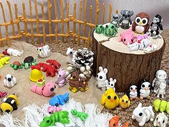 The set includes: 102 3D-printed animals, comprising 52 larger creatures and 50 miniature miniatures. Their unique styles and color variations make them perfect for children who love surprises and variety Flexible articulation: Featuring movable joints, these dolls make perfect fidget toys for both children and adults. Bend and pose them anytime, anywhere to relieve stress or spark imagination Perfect for any occasion: Makes an enchanting desk accessory, a fun party gift, or a delightful classroom reward. Compact enough to slip into pockets or bags, it's ideal for home, office, or travel entertainment Safe and Durable: Crafted from premium non-toxic materials, these figurines are designed for children aged 3 and up, built to last and provide enduring entertainment and stress relief Thoughtful gift selection: The perfect birthday and holiday gift—a memorable present that will be treasured for years to come