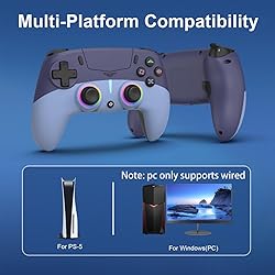 [Important – First-Time Setup] - For first-time use, please follow the steps below: PS-5 controller off → Connect with included USB Cable → Unplug Cable → Press Home button→ Select user → Log in [2 Back Buttons] - The controller with paddles (with 2 back buttons) support programming or mapping,let you perform complex actions, like combos, without taking your thumbs off the sticks, giving you more control and speed.NOTE : PC only supports wired mode [RGB Lighting] - The controller features customizable RGB lighting, allowing you to change colors and effects according to the game, enhancing visual effects and boosting the gaming atmosphere [Dual Vibration&Headset MIC] - This controller delivers realistic dual-vibration feedback for immersive gameplay, and lets you communicate effortlessly with your teammates through the headset microphone(No built-in microphone; only supports headset microphones) [Professional After-Sales] - If you encounter any issues during use, please feel free to contact us. We have a professional after-sales service team that can help you resolve problems. Thank you!