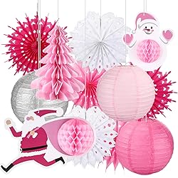 - Features: Pink Christmas elements are perfect for heartwarming winter gatherings or princess-themed Christmas birthdays, bringing a unique Christmas atmosphere. Each holiday decoration is equipped with a hanging rope or hook, which can be easily hung and arranged without complicated operations, saving time for arrangement. Specifications: Material: paper Color: pink and white Size: Pink Christmas tree honeycombs: approx. 9.84 inches/ 25 cm Paper lanterns: approx. 10 inches Rose-red snowflake paper fans: approx. 7.87 inches/ 20 cm Light pink snowflake paper fans: approx. 11.81 inches/ 30 cm White snowflake paper fans: approx. 11.81 inches/ 30 cm Package includes: 1 x Pink Santa honeycombs 1 x Pink snowman honeycombs 1 x Pink Christmas tree honeycombs 3 x Paper lanterns 6 x Snowflake paper fans Notes: Manual measurement, please allow slight errors on size. The color may exist a slight difference due to different screen displays. Small parts included, please keep them away from little kids to avoid swallowing risk