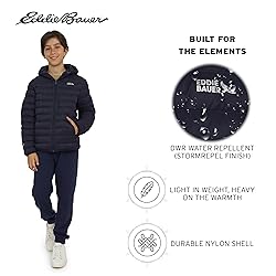 EDDIE BAUER LIFESTYLE: A legacy of adventure-driven innovation, Eddie Bauer is committed to a more sustainable and inclusive future. The brand uses materials and methods that minimize environmental impact, building an outdoor culture that is open and welcoming to everyone. VERSATILE & STYLISH: The ultimate jacket for boys! Our reversible design instantly transforms their look for any adventure, making it a perfect go-to for the colder seasons. It effortlessly pairs with everything—from jeans and leggings to ski pants and hoodies. Complete with a signature reflective Eddie Bauer logo for a touch of iconic style and added visibility. PREMIUM COMFORT & COZY WARMTH: Unleash their inner adventurer with a jacket so light, they'll forget it's there. Our ultra-cozy 650-fill down blend delivers a cloud-like warmth that feels incredible, so they can stay active and comfortable on the coldest days. BUILT FOR THE ELEMENTS: Ready for anything the weather throws their way! The powerful water-repellent finish causes rain to bead right off, while the fixed hood and clever draft-blocking binding work together to create a fortress of warmth that seals out the chill. SMART DESIGN & QUALITY CONSTRUCTION: Designed for real-life adventures, this jacket is built to last. Our special down-proof coating guarantees feathers stay exactly where they should be, while secure zippered pockets keep treasures safe. And because it's machine washable, life's messes are no match for this jacket.