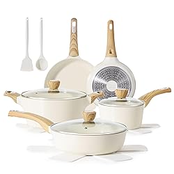 Healthy Ceramic Cookware Set - Upgraded Swiss Granite Ceramic non-stick surface, safe and non toxic, free of PFOA, PTFE, PFAS, PFOS, lead, cadmium and other toxic substances that can leach into food. Natural Nonstick - Ceramic non-stick is healthier than Teflon coating! Scratch-resistant with excellent food release. Only less oil is needed for cooking, for a healthy, low-fat diet. 14 Piece Pots and Pans Set Includes - 8 & 11 Inch frying pan set, 10Inch/3QT saute pan with lid, 4.5 QT casserole with lid, 1.5 QT saucepan with lid, 2 pcs multi-purpose utensils, 4 pcs pot protectors. Perfect for a family of 3-4 people. Easy to Clean - Simply wipe with a paper towel or rinse with water, hand washing is recommended as it cleans effortlessly. Induction Compatible - 4.8mm thick stainless steel pan bottom makes this cookware set suitable for all stovetops. Die-cast aluminum construction allows the pan to heat up quickly and evenly, keeping the heat consistent. No warping and durable. Stay-Cool Handle & Glass Lid - The anti-scald wood-grain Bakelite handle is ergonomically designed for comfort and ease of handling. The explosion-proof glass lid prevents splashing and ensures maximum visibility.