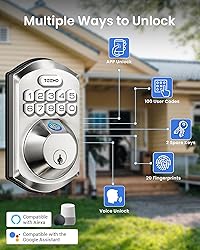 Built-in Wi-Fi, Remote Control: No additional gateway required, the smart lock connects directly to 2.4GHz home Wi-Fi, allowing you to unlock remotely, manage access permissions, view activity logs, and share passcodes with no distance limits. It provides stable and reliable connectivity for convenient remote access control in daily use Voice Control & Smart Home Integration: This Wi-Fi door lock works with Google & Alexa Assistants to support voice commands for locking and lock status checks, and integrates with other smart home devices to automate routines, such as turning on lights when arriving home or turning off air conditioning when leaving. Designed for convenient hands-free control during daily use, like carrying groceries or holding a child 1s Instant Fingerprint Unlock: Features 99.99% fingerprint recognition accuracy, recognizing fingerprints in 0.2s and unlocking the door in 1s. Its self-learning fingerprint system improves speed and consistency with regular use. Fingerprints can be easily added or removed in the app, making daily access simple when coming home from work, jogging, or walking the dog 6 Ways to Unlock: Supports up to 100+ user passcodes, 20 fingerprints, 2 backup keys, app remote control, passage mode, and voice unlock compatible with voice assistant. Designed for flexible daily access management, whether letting family entrance, sharing access with guests, or handling deliveries for front, back, or side doors in homes, rentals, and apartments Remote Code Sharing with No Distance Limits: Share one-time, recurring, duration, and permanent codes remotely via the KK Home app with no distance limits compared with other locks. One-time codes auto-delete after use for deliveries or cleaners, duration codes suit guests or short stays, recurring codes support weekly services, and permanent codes are for family members. All access can be managed or removed in the app as needed Manage User Permissions & Data Security: Share access permissions with family, friends, or tenants, and track every unlock and operation logs in real time via the app. Permissions can be added or adjusted instantly, and all data are stored locally on the Wi-Fi fingerprint lock, giving flexible control while ensuring privacy and security for homes or rental properties Long Battery Life with Dual Low Battery Alerts: This Wi-Fi digital door lock with keypad set runs on 8 AA batteries, lasting over 8 months under normal use, extending battery life compared with 4 AA powered locks. When power drops below 20%, the red light indicators and the KK Home app sends a low-battery alert, preventing lockouts. 2 backup keys allow entry even if Wi-Fi fails or batteries die Durable Zinc Alloy Material for Exterior Door: Made of zinc alloy, this WiFi fingerprint deadbolt lock is sturdy and anti-pry, suitable for front doors, rentals, and outdoor installation. Its metal construction works reliably in -35°F to 160°F and features IP55 waterproof, ensuring stable performance in rain, snowstorm or humidity Easy to Install & Customer Service: The Wi-Fi smart digital door lock installs in minutes using one screwdriver, with no drilling required. Designed for standard U.S. doors, it fits wood and metal doors with 2-1/8" (54 mm) door holes, 2-3/8" or 2-3/4" backset (60/70 mm), and 1-3/8"–2" (35–50 mm) door thickness. It offers a 2-year warranty and lifetime customer service, including online phone support from Monday to Friday, 9 AM to 5 PM PST, and 24/7 online email service