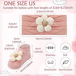 What’s Included: This adorable set comes with 4 pairs of baby girl flower socks and 4 floral headbands for babies, versatile colors. Suitable for adorning your little princess, whether you're dressing her up for a special occasion or her everyday outfits. Reliable material: Crafted with soft, breathable cotton materials featuring reinforced seams for durability, these baby girl socks and headbands are designed for gentle comfort on baby skin. The floral headbands keep their shape and vibrant colors Baby socks and headbands set: the soft and breathable cotton socks fit 0-12 months, foot length about 9cm/3.54 inch with matching stretchy flower headbands (0-3 years). Suitable for baby shower gifts or newborn infant essentials Daisy flower design: these baby girl socks and headbands feature wash-proof 3D floral accents that won't easily deform. The nylon-reinforced flowers stay perky through playtime, laundry, and photo shoots, reliable and practical companions for her Pro Mom Tips: Simply stretch the soft headband to fit comfortably, position the 3D flower for adorable photo-ready looks. Hand wash recommended, preserve those delicate floral details