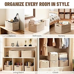 - Simplify your home organization with our 5 Pack Woven Cotton Rope Storage Baskets — designed to combine functionality and aesthetic appeal. Each rectangular basket measures 13.8""L x 9.8""W x 7.9""H, perfect for organizing toys, books, clothes, towels, toiletries and daily essentials. Crafted from 100% natural cotton rope, these bins are soft to the touch, safe for kids, and free from toxic materials or sharp edges. Their neutral beige and white tones seamlessly fit into any home decor style — from modern minimalist to rustic farmhouse. Whether placed in your nursery, closet, bathroom, or living room, these baskets keep everything organized while adding a touch of elegance. Durable yet lightweight, they are easy to carry, stack, and store when not in use. Perfect for families, parents, pet owners, and anyone who loves a clean, cozy home. This 5-pack of cotton rope storage bins is the perfect choice for stylish and practical organization. — your home deserves it.