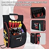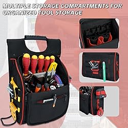 - 1.Made of 1680D fabric with a reinforced PE bottom panel, this tool pouch is long-lasting and provides reliable protection for your tools. It maintains an upright position, eliminating the need to bend over or hold the pouch while working—making tool access more convenient. Dual zipper design ensures smooth opening and closing. 2.Tool pouch dimensions: 10.83"L x 5.3"W x 15.2"H. It offers ample storage space. Front grid storage allows accessory mounting for customization and enhanced usability. Main compartment features a zippered flip cover; the built-in hook-and-loop fastener adheres to the bottom of the pouch, keeping it open during work for easy tool access. 3.Features a detachable and adjustable shoulder strap and an ergonomic rubber handle. Switch between carrying options as needed. Ideal for electricians, technicians, HVAC, maintenance workers, plumbers, cable installers, handymen, construction workers, DIY enthusiasts, contractors, and more.