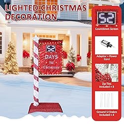 Remote Control: This 5FT lighted Christmas countdown sign can be set to count down from 0 to 60 days through the remote control of the product. Please note that addition and subtraction are used to adjust the number of days. When using them, please align the remote control with the light. You can put this lighted sign on the ground to welcome your family and friends. Bringing festive atmosphere to you LED Lights: The pre-lit Christmas countdown sign is installed with dense 125 LED lights beads which make it sparkles cool white in the sun and night. Light up your front yard, make you become the focus of your neighbors Premium Quality: Our lighted Christmas decoration is made of a high quality powder-coated steel frame which ensures the long service life. It is durable enough for you to use year over year and it wouldn’t break easily. Decorative tinsel fabric gives you soft feeling while touching it Weather Friendly Design: This freestanding holiday display is equipped with 16.4FT water resistant cord and lights, the light bulb is waterproof and snow proof, so you don' t have to worry about safety issues. Although, it has 125 LED lights, it’ s still energy saving. Besides, pre strung fairy lights remain cool to the touch in constant warm white Easy to Assembly: It only takes 3 steps to assembly. Step 1: Take out all the items from the package. Step 2: Assemble it according to the instructions. Step 3: Plug in the socket to light it up. If you are going to use this light on the ground, don’ t forget the ground stakes included that will make it well fixed