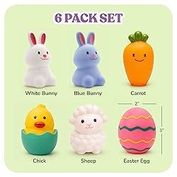 EASTER BATH BUDDIES 6-PACK: Beautifully designed Easter bath toys set featuring two bunnies, a sheep, a chick, a carrot, and a decorated egg. Each character has soft colors, friendly details, and a charming look that feels special and festive. They float and bob through the bubbles, turning every bath into a playful Easter party kids love. MOLD-FREE & WORRY-FREE DESIGN: Completely mold-free bath toys with no holes to trap water. Designed to stay clean and dry inside, giving parents peace of mind while toddlers enjoy safe, hygienic bath time fun with their favorite Easter friends. SOFT, SQUEEZABLE & KIDS FRIENDLY: Made from soft, smooth, squeezable material that is gentle on little hands. Each toy is perfectly sized at about 3 inches tall, making them easy for toddlers to grasp, hold, and play with during Easter bath time. SAFE & BABY-FRIENDLY: Made from non-toxic and phthalate-free materials for worry-free bath time play. Designed with smooth, rounded edges and a soft, gentle feel that is safe for little hands, giving parents confidence and babies and toddlers a safe, comfortable, and fun bath experience. PERFECT EASTER BASKET STUFFERS GIFT: Comes in a bright, gift-ready box that is perfect for Easter baskets, toddler gifts, and springtime surprises. These adorable Easter toys for toddlers 1-3 are ideal Easter basket stuffers for kids, party favors, and small gifts that add excitement to bath time while encouraging screen-free play and imaginative fun.