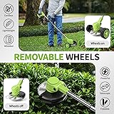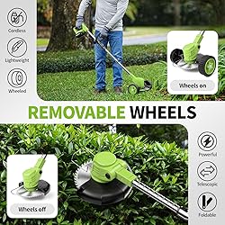 [ 4 Types Cutting Blades ] -- Cordless weed wacker has 4 types of blades to meet different needs. (1) Circular saw blade is suitable for cutting branches and thicker shrubs. (2) Metal blade is suitable for pruning small shrubs and hedges. (3) Steel string is suitable for trimming soft grass. (4) Plastic blade is suitable for mowing light weeds. [ Powerful & Lightweight ] -- Electric weed wacker comes with an upgraded powerful motor and 2 x 2.0Ah li-ion batteries for higher efficiency and longer use. In addition, it weighs only 4.4 pounds, which is ideal for women and seniors. [ Removable Wheels ] -- This electric lawn mover is equipped with removable wheels, which enhances the operability of the weed eater and saves your energy. You can use the grass cutter to weed your lawn, cut branches, and prune hedges easily. [ Adjustable & Foldable ] -- Cordless weed eater has a telescopic bar that can be freely adjusted from 35 inch to 47 inch. The head angle can be changed from 0-90° to cut sloping lawns or hard-to-clean gaps. What's more, this brush cutter can be folded for portable use and easy storage. [ Extensive Accessory Kit ] --1 x Weed Wacker Cordless, 2 x Circular Saw Blades, 4 x Metal Blades, 5 x Steel Wire Blades, 10 x Plastic Blades, 1 x Labor-Saving Grip, 2 x 2.0Ah Batteries, 1 x Charger, 1 x Protective Cover, 2 x Wheels, 1 x Gloves, 1 x Goggles, 1 x Tool Kit, 1 x User Manual. Also, this weed wacker is compatible with Makita batteries. [ Reliable Customer Service ] -- FULLYEA has professional factory and quality service. If you have any questions about this cordless weed trimmer, please feel free to contact us! < Note > This small weed trimmer is not suitable for large areas or dense, tall weeds.