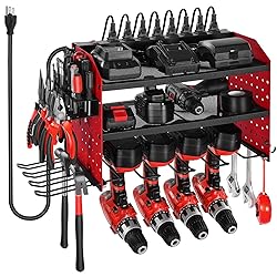 Efficient Storage: This 3-tier wall-mounted power tool rack (23.31 x 8.66 x 12.01 in) has an adjustable middle shelf, 4 drill slots, pegboard sides, hooks, and holders to keep tools neat and handy 8-Outlet Power Strip: Built-in 8-outlet strip of the power tool organizer (5.58 ft cord, max 1875W) on the top shelf lets you charge multiple tools at once while keeping your workspace tidy and organized Pegboard Side Design: Dense 0.24-inch peg holes of the hanging tool organizer fit various accessories. Store drills, hammers, screwdrivers, wrenches, and more—all within easy reach when you need them Sturdy & Durable: Premium carbon steel frame of the power tool storage rack supports 100 lbs total (33 lbs per tier). Powder-coated finish resists rust, and mesh shelves improve airflow to keep tools cool Easy to Install: Our drill organizer includes mounting hardware and simple instructions. Fits concrete, brick, wood, and stud walls. Ideal for workshops, garages, or as a present for DIY lovers