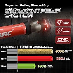 - EZARC Diamond Coated Screwdriver Bit Set is designed for reliable performance, durability, and precise screw fastening in tight or hard-to-reach spaces. Suitable for impact drivers, power drills, automotive work, electronics, and general DIY tasks. Diamond Coating for Enhanced Grip Each bit is coated with diamond material to increase friction on screw heads. This helps reduce slippage and wear compared to standard bits, generally extending the service life of the bits under repeated use. Precision Design for Controlled Operation A black phosphate finish helps reduce reflection for better visibility, while the diamond-coated micro-teeth structure supports stable screw engagement. Magnetic tips hold screws in place during angled or overhead work, helping maintain control in confined or tight spaces. Long 2-9/16" (65mm) Bits Longer than standard 2" bits, these 65mm bits reach deeper engine compartments, control panels, and junction boxes. This length can reduce the need for disassembly and improve accessibility in tight areas. High-Strength S2 Alloy Steel Constructed from high-quality S2 alloy steel, these bits feature a slim-waist, impact-resistant design. They provide consistent performance with power drills and impact drivers, reducing the risk of tip breakage during higher torque tasks. Comprehensive 10-Piece Set Includes Torx T15-T40, Phillips PH1-PH2, Pozidriv PZ2, and Slotted SL4.5-6.0 bits. Each bit is CNC-machined with precise tolerances, supporting consistent and stable screw placement across automotive, electronics, and DIY applications. This screwdriver bit set combines durable materials, diamond coating, and precise design to provide reliable performance for a wide range of tasks, from automotive and electronics work to general DIY projects.