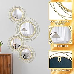 【 UNIQUE CIRCLES LOOK ADDS A LOT TO YOUR HOME 】these mirrors wall decor have circle on circles design . it’s a novelty home décor with modern and artistic. 【 SET OF 4 IN DECENT PACKAGE 】package come with 4 pieces cute mirrors in it, which are prepared for free styling and combination with other wall art pieces. Just arrange and match as you like with these cost-effective mirror arts. 【 IRON FRAME - STURDY AND EASY TO HANG 】 Hanging these round mirrors with just one screw put into the wall. The mirror weight is 2lb, which is light to install. High quality annealed glass prevents warping and distortion, give you a real HD imaging. 【 JUST THE RIGHT SHADE OF GOLD 】 The gold framing of these art pieces is something between matte and a bright gold, not too bright and not dull , just perfect to pop a dark wall. Crystal clear mirror adds a shade of reflection to the space nicely. 【 COLOR AND STYLE MATCHES EVERYTHING 】 These mirrors are the perfect addition to the picture wall or above the TV, or to the entryway and office space. They can style a wall independently or combined with other pieces of wall art like paintings/wall sculpture/candle sconces. It will look great anywhere you can try.