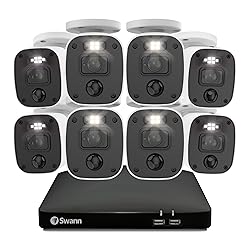 - Secure your home with the Swann Wired 4K DVR Security System, featuring a 8 Bullet Camera Kit engineered for exceptional clarity and reliability. Powerful white, blue, red spotlights deter intruders, while ultra-HD 4K resolution and full-color night vision ensure every detail is captured, day or night. Advanced True Detect™ technology minimizes false alarms by accurately sensing heat and motion, and AI-powered video analytics instantly notify you of people, vehicles, or suspicious activity. Built-in spotlights provide active deterrence, while the wired connection ensures uninterrupted, 24/7 protection. Easily stream live footage or review recordings using the Swann Security app or watch directly on your TV via HDMI. With no hidden fees, a built-in 1TB hard drive for local storage, and optional cloud backup for up to 60 days through a Secure+ subscription (starting at just $14.99/month), setup is simple and stress-free. Protect your home with confidence, clarity, and complete control.