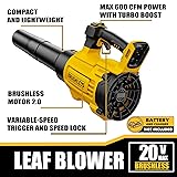 TOOL ONLY – BATTERY AND CHARGER NOT INCLUDED Fully compatible with Dewalt 20V MAX battery including DCB200, DCB201, DCB203, DCB204, DCB205, DCB230, DCB240 and more—no need to buy a new battery system. PREMIUM BUILD QUALITY: Constructed with automotive-grade, UV-resistant reinforced plastic for superior durability. Outperforms standard ABS blowers with enhanced impact resistance—no cracking, fading, or deformation under sun exposure or tough jobsite use. Max 600 CFM TURBO BOOST AIRFLOW: Innovative honeycomb turbine structure with turbo boost mode provides max airflow up to 600 CFM and wind speed up to 125 MPH, blasts away leaves, debris, and grass in seconds—ideal for driveways, patios, and lawns. NOTE: Performance based on lab testing at optimal battery charge; actual results vary by battery level and environment. BRUSHLESS 2.0 MOTOR – POWER & EFFICIENCY: High-efficiency brushless motor delivers stronger airflow, longer runtime, and lower noise. With a 4.0Ah Dewalt 20V MAX battery, it runs up to 30 minutes in Standard Mode or 12 minutes in Turbo Mode, covering as much as ½ acre of yard work efficiently. USER-FRIENDLY & LIGHTWEIGHT: Variable-speed trigger with cruise control for effortless operation. Ultra-light and compact design with non-slip rubber handle—comfortable for one-handed use and especially friendly for seniors. WORRY-FREE AFTER-SALES SUPPORT: Enjoy 90-day free returns and replacements, plus a 1-year limited replacement program. Professional and reliable service for a truly risk-free purchase.