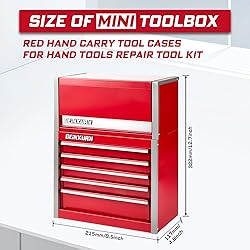 Organizers and Storage :1 pc 8.6 X 4.6 X 4.8 inches red 3 tier mini tool box (micro top chest) and 1 pc 8.6 X 4.6 X 7.9 inches red 5-tier mini tool box(micro roll cab), lightweight and portable design. Multiple Storage Mini Tool Box: You can match the 3-tier top chest with 5-tier Micro Roll Cab to use together or separately. Please check the size before you place an order. It's a small box, if you mind, please don't buy it Materials: This tool box made of high quality Q235 steel, with red powder coat finish and magnetic locking, it looks very cool and easy to clean. Smooth Glide and Anti-Slip Pads: These two mini tool cases every layer equipped with a smooth glide. On the other hand the anti-slip pads on the bottom of the box to be stable. Great Gift Choice: This tool kit is easy to carry and stock. It is a good gift choice for men and women. Strong function for home, office, warehouse, jobsites and so on. The micro tool box is suitable for storing small tools and accessories storing various parts like business cards, pens, pencils, paper clips, and much more