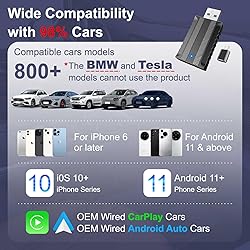 Wireless CarPlay & Android Auto Adapter – Ditch the Cables! Tired of messy wires? This compact plug-and-play adapter instantly upgrades your wired CarPlay or Android Auto to wireless—just plug it in and enjoy a seamless connection every time you start your car! Works with both iPhone (CarPlay) and Android phones (Android Auto), delivering smooth, lag-free performance for navigation, music, calls, messages, and voice commands. Drive smarter with a clutter-free, wireless setup! Smart Wireless Connection in 3 Simple Steps: 1:Plug into your car's USB port, 2:Connect your phone wirelessly, 3:Enjoy automatic pairing. No cables needed, no apps to install - just true plug-and-play convenience. After initial setup, your phone connects automatically when you start the car (Compatible with iPhone iOS10+/Android 11+). The entire connection process takes just 3 seconds for seamless smart driving. Compatibility Notice: This wireless adapter is designed exclusively for vehicles with factory-installed CarPlay or Android Auto functionality (2016-2025 model years). Please note: Not compatible with Tesla or BMW vehicles Requires existing wired CarPlay/Android Auto support In addition, the wireless adapter does not support YouTube and Netflix video playback, mainly to ensure driving safety. Compatibility Information: This wireless car video play adapter supports: iPhone: iOS 10+ Android: 11 and later Included Adapter: Comes with a USB-to-USB-C converter for universal compatibility with both standard USB and USB-C car ports. Important Note: If your vehicle does not have built-in CarPlay/Android Auto, please do not purchase. Native Wireless CarPlay: Your iPhone, Fully Integrated. Experience total integration with your car's dashboard. Our adapter delivers: 100% Wireless Freedom: True cable-free convenience for maps, music, calls, and Siri. Full Native Control: Everything works as it should—touchscreen, steering wheel buttons, and voice commands. Designed for Safety: Keep your eyes on the road and your hands on the wheel for a safer, more intuitive drive. Upgrade Guide: Connect your iPhone or Android device to the WiFi hotspot provided by the CarPlay box (WiFi name and password: 88888888). Open your browser and enter the address: 192.168.8.1. Click "Online Upgrade" and wait for the device to automatically complete the upgrade and reboot.) What’s in the Box Inside the box, you’ll find 1* instruction manual, 1* wireless adapter itself, 2 * black USB extension cables( 1* female-to-male USB-A adapter and 1* USB-A to USB-C adapter) for modern CarPlay or Android Auto ports.
