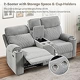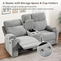 Spacious Seating Comfort: This extra-wide Power reclining loveseat is designed with generously overstuffed cushions and broad seating space to provide exceptional comfort for two. Perfect for cozy evenings at home or movie nights, it allows you and your partner to lean back, relax, and enjoy ultimate full-body support Easy Reclining Mechanism: The two outer seats of the sofa offer a user-friendly electric reclining mechanism allows you to recline effortlessly. Whether you want to sit upright for reading, lean back for watching TV, or fully recline for a nap, our recliner loveseat adjusts smoothly to meet your comfort needs Premium Material: The oversized reclining loveseat sofa is made of soft and comfortable fabric material and filled with high-density sponge, making the headrest, lumbar support, and armrests soft, and the cushions are overstuffed for your comfort while reading, watching TV, or taking a nap in your living room Convenient Center Console: The power reclining loveseat features a center console with built-in cup holders and hidden storage, providing the perfect spot for drinks, remotes, and other essentials while keeping your living space neat and organized Stable Constructure: The 2 seat reclining sofa is constructed with a solid wood frame and metal base. The wood frame allows the recliner to last longer, and the sturdy metal base has been tested to 25,000 cycle life and can easily support up to 700 pounds