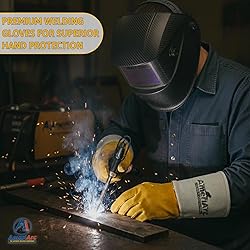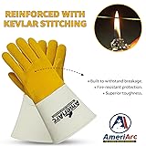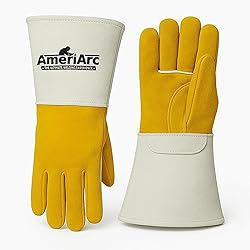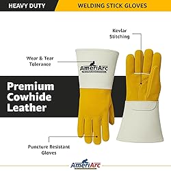 - Premium Leather Fire-Resistant Welding Gloves Our AmeriArc stick welding gloves are crafted from premium cowhide split and top-grain leather, offering superior durability, flexibility, and heat resistance. With extra-long cuffs, these fire resistant gloves protect hands and forearms from sparks, spatter, and hot debris, while reinforced palms and fingers provide added strength for demanding industrial tasks.Industrial-Grade Stick Welding Gloves Designed for both men and women, these heavy duty work gloves provide a firm yet flexible fit for precision and dexterity. The soft interior lining absorbs sweat and reduces fatigue, making them ideal for stick welding, fabrication, construction, and heavy-duty metalworking, while offering reliable protection during long hours of industrial work.KEY FEATURES:Premium Leather Construction: Our welding gloves are made from cowhide split and top-grain leather, providing durability and protection. Extra-Long Cuffs: These Large welding gloves protect hands and forearms against sparks, spatter, and high heat.Reinforced Palms & Fingers: Our men's welding gloves provide added strength and resistance against wear, punctures, and tearing.Comfortable Interior Lining: These puncture resistant gloves are designed to absorb sweat and reduce fatigue during long work hours. Precision & Dexterity: Firm yet flexible fit allows welders to maintain control effortlessly.Industrial-Grade Safety: Our welding gloves are ideal for stick welding, construction, fabrication, and heavy-duty tasks.