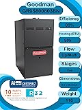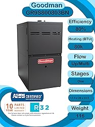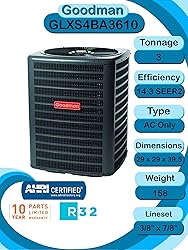 - This HVAC system includes the Goodman GLXS4BA3610 air conditioner unit which is a 3 TON ac unit. This residential ac unit be sold nationwide. The second piece of this bundle is the Goodman CAPTA3626B3 vertical coil. Please note that this coil is NOT compatible or convertible to use in a horizontal configuration. If you are unsure of what you need, simply look at your furnace, if it is laying down, you need a horizontal coil. If your furnace is standing up, you need a vertical coil. This coil is 17.5 inches wide and you should ensure that your furnace is the same width, or very close, for ease of installation and optimal airflow. The final part of this furnace and AC system is the Goodman GR9S800803BN natural gas furnace which operates at 80% efficiency and is rated at 80k BTU. This single stage furnace is designed to provide the full heating capacity when running. Note: This furnace is NOT compliant with the emissions regulations in California and cannot be sold to or shipped to California. Please contact us if you need a California compliant furnace. Regardless of the SEER2 rating of the outdoor unit alone, the Goodman GLXS4BA3610 this bundle has been determined by AHRI to function at 15.2 SEER2 efficiency. This comes with the equipment pad for the condenser, the power whip, disconnect, 25ft lineset and non-programmable thermostat Warranty: This unit is backed by Goodman's 10 year parts warranty so long as it is registered online through Goodman within 60 days of installation. The installer must adhere to all applicable laws and regulations.