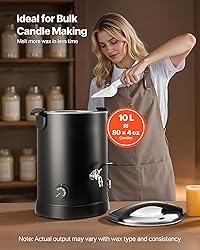 Effortless to Use: Ideal for beginners, this wax melter for candle making features simple operation and intuitive steps. With the included accessories, you can start your candle-making journey with ease Fast, Even Heating for Big Batches: The powerful 1100W heating system with a large coil ensures fast and even melting. Our large wax melter melts up to 2.2 lbs of soy wax in just 10 minutes—ideal for batch production or time-sensitive crafting Mess-Free Wax Pouring: The candle wax melter for candle making features a built-in heated spout and hourglass bottom design to ensure smooth wax flow with no clogging or dripping. Easily pour into molds or containers without mess Wide Temp Range for Various Waxes: This candle wax melting pot adjusts from 86 ℉-230 ℉ to suit soy, coconut, paraffin, beeswax, and more wax types. Consistent heating avoids overheating or burning, ensuring smooth and even melting every time Versatile, Reliable, and Gift-Ready: Our candle making machine is great for crafting candles, soaps, lipsticks, beauty products or festive presents. It is built with overheating protection, heat insulation shield, and a stable base for effortless use