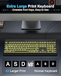 【Large Print Keyboard】4X larger than standard wired keyboard fonts, clear and easy to find. Alleviate your eyes, reduce typing errors, ideal for elderly, the visually impaired, students, special needs departments and libraries, etc. 【7 Backlights & 2 Modes】Bright and evenly distributed backlit keys has 4 levels of brightness, 7 different colors, and 2 backlight modes. Backlit can choose to turn on/off and adjust brightness, making it more convenient to type in low-light environments 【Plug and Play & No Latency】This USB computer keyboard requires no charging or battery replacement; it's plug-and-play, offering fast response speed and no delay for a smoother typing experience. 5.25ft USB cable for easy connection to Windows, PCs, laptops, MAC OS, and Chrome. Note: multimedia keys may not be fully compatible with MAC OS systems 【Boost Your Productivity】Save time with 12 multimedia keys and 10 hotkeys that allow instant access to most-used applications like email, calculator, etc. 【Full Size & Ergonomics Design】Unfold the feet at back of the keyboard to reduce hand fatigue. Full QWERTY English (US) keyboard layout with numeric keypad, Large Print keys provides superior comfort without forcing you to relearn how to type. 【Spill-proof】This durable wired light up keyboard features a spill-resistant design. So you don't have to worry about spilling coffee and water. Enjoy Keys life of more than 5000W times. 【Warranty】Have a free one-year replacement warranty. If you have any issues, please contact the seller first. Professional customer service is on call 24 hours daily to solve your problems.