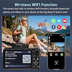 【8K UHD & 64MP Photography Camera】This digital camera can capture stunning 64MP images and shoot 8K UHD videos with rich colors and clear details. Various built-in filters will bring a unique creative experience to your photography 【4-inch Large Touch Screen and Dual-lens Camera】This dual-lens Cameras for Photography lets you take selfies without any assistance, creating the perfect selfie or dynamic vlog. The large 4-inch HD touch screen allows you to frame, focus and shoot with just a few taps 【Best YouTube Camera for Content Creators】The 8K vlogging camera can be connected to a computer via a Type-C data cable to be used as a webcam, and the camera is equipped with a 3.5mm microphone jack, a hot shoe, and a 1/4 standard size external tripod interface 【WIFI Function & 3000mAh Large Capacity Battery】The vlog camera has built-in WIFI function. When you are playing outdoors, you can easily transfer files to your mobile phone and share them instantly. The camera for vlogging is also equipped with a 3000 mAh large capacity battery, so you don’t need to replace the battery frequently 【Perfect Gifts & Service】This 8k digital camera with wifi is the perfect gift for photography enthusiasts and beginners. because it is simple to set up and easy to operate and control. If you have any problems with this travel camera, please feel free to contact us and we will get back to you within 24 hours 【Package & Size】The compact digital camera comes with 8K camera*1, 32GB TF card x1, USB cable x1, Neck strap x1, 3000mAh Li-lon battery x1, Manual x1, Cleaning cloth x1, Lens hood x1 and Lens cap x1. The SIZE of the camera is 5.6''(Length) * 3.5''(Width) * 3.9''(Height)
