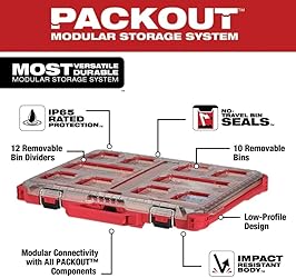 Part of the PACKOUT modular storage system Slim design for organization of small items 10-removable bins: 8-small and 2-large bins with dividers Constructed with impact resistant polymers Clear top for easy identification of contents No-travel bins seal prevent small part migration between bins IP65 rated weather seal Integrated center slot for long bits and blades Heavy-duty latches Reinforced hinge