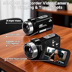 【56MP 4K Ultra HD & 18X Digital Zoom】This 4k camcorder captures smooth, high-resolution 4K Ultra HD videos that keep every frame sharp and true to life, and 56.0-megapixel photos that show fine textures, bright colors and small details clearly. The video camcorder paired with an F/2.0 large aperture for sharp details and vivid colors. 18X digital zoom lets you easily focus on distant subjects, making this digital camcorder perfect for daily life, travel, or short video creation. 【3.0-Inch 270°Rotatable Touchscreen】Featuring a 3.0-inch touchscreen with 270° free rotation, this camcorder offers flexible framing for selfies, low-angle shots, and group photos. The intuitive touch control design makes operation simple, allowing vloggers and beginners to master this 4k camcorder video camera quickly. No more awkward button fumbling—just tap, rotate, and shoot seamlessly with this user-friendly video camera. 【IR Night Vision & Multi-Shooting Modes】Press the “OK” button to activate the infrared filter. This night vision digital camcorder delivers high-contrast black & white video even in total darkness, providing clearer, more detailed footage than standard low-light color mode. It also supports multiple practical modes including slow motion, loop recording, time-lapse, and continuous shooting, meeting diverse creative needs for day and night scenarios. 【WiFi Transfer & Remote Control】Built-in WiFi enables easy connection to your mobile phone for fast file transfer and shooting control. You can instantly transfer all your videos and photos from the camcorder video camera to your phone, so you can share your favorite moments with friends or post them on social media anytime, anywhere, without the hassle of using cables or card readers. It comes with a remote control that supports remote shooting and video recording, offering hands-free convenience for solo creators, group shots, or scenarios where you need to avoid camera shake. 【Webcam for Live Streaming & TV Playback】Connect via USB-C cable to instantly use this camcorder as a webcam for live streaming or video calls. It also supports HDMI interface for direct TV playback, letting you share wonderful videos with family and friends on the big screen. Whether you’re live streaming on social media or hosting a home movie night, this 4k camcorder adapts to every scene effortlessly, and this digital camcorder’s dual-function design adds extra value for daily use. 【Complete Accessories & All-Round Service】Comes with all essential accessories: 4k camcorder black, battery, camera bag, cables, remote control, lens cover, and 64GB memory card. User-friendly and easy to operate, this camcorder video camera is ideal for beginners. What’s more, its sleek and compact look makes it a thoughtful gift for friends, family, or photography enthusiasts on birthdays, holidays, or graduation days. Our 24-hour support team is available to answer any questions about cam corder you may have.